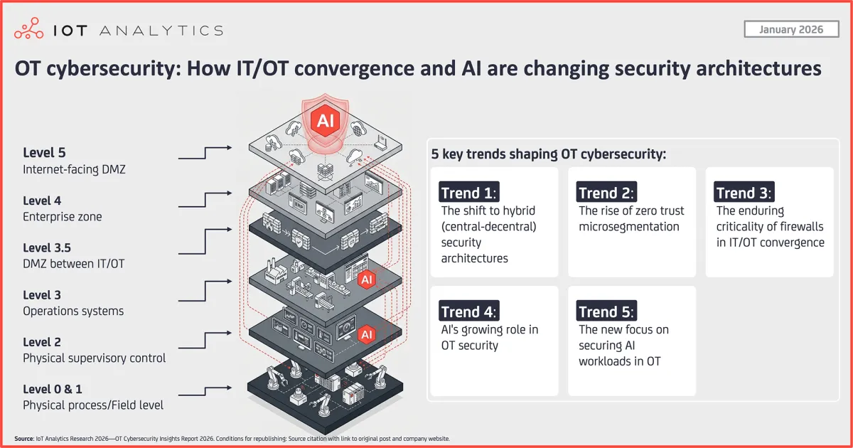 IoT Analytics said the combination of hybrid architectures, microsegmentation, perimeter controls at IT/OT junctions and AI security measures will shape security roadmaps as industrial AI adoption continues and more plants connect operational systems to enterprise and cloud environments.
